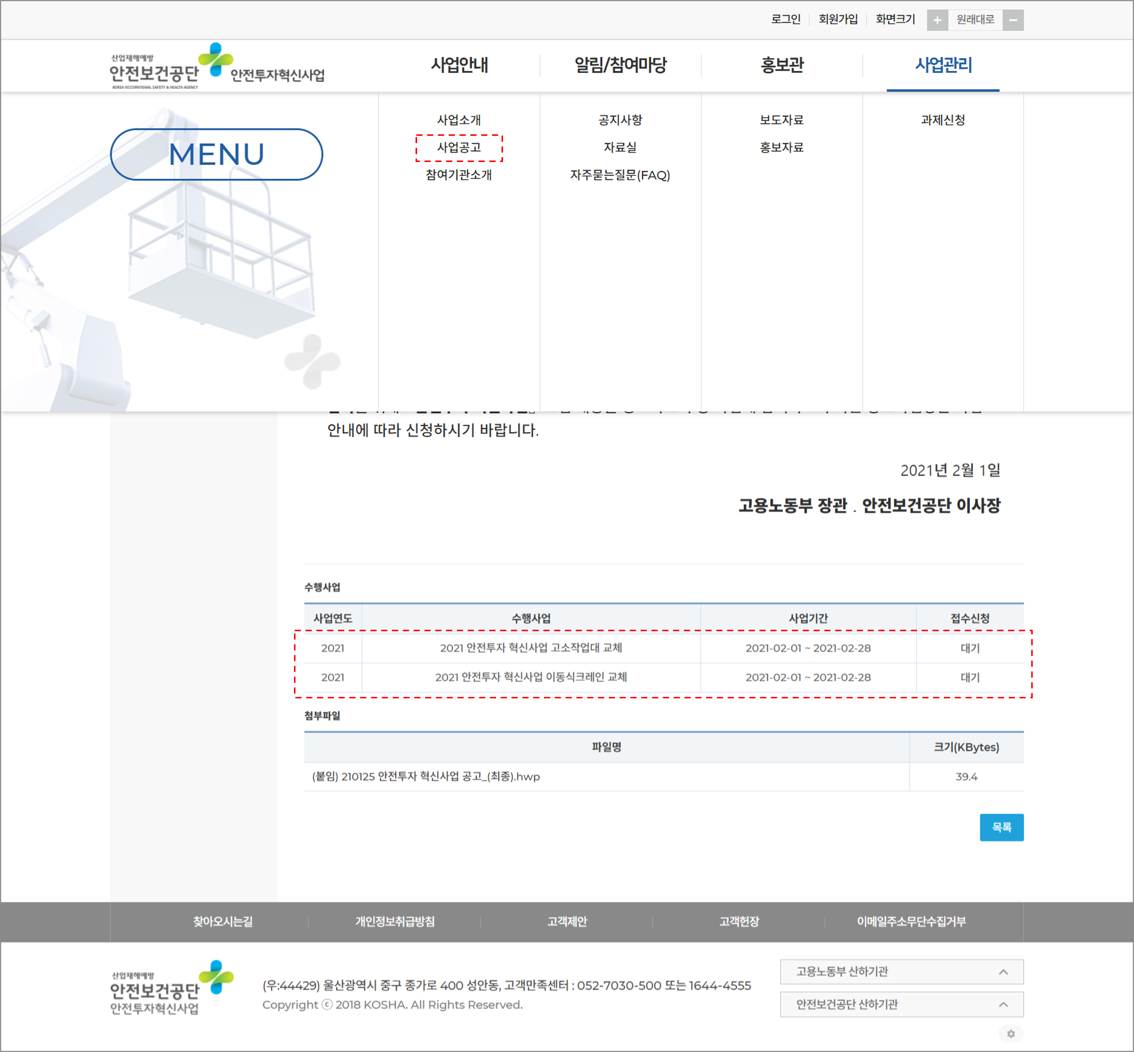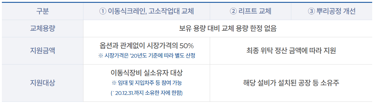 현재 사업공고가 올라온 사업은 고소작업대와 이동식 크레인 교체에 대해 2월 1일부터 신청을 받고 있으니 준비해서 빨리 신청해야겠습니다.
